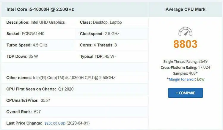 | CPU | Intel Core i5-10300H (4C/8T, 2.5GHz up to 4.5GHz, 8MB Cache) |