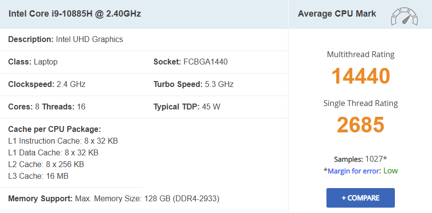| CPU | Intel Core i9-10885H, 8 Cores / 16 Threads, up to 5.30 GHz, 16MB Cache, 45W TDP (10th Gen, launched 2020) |