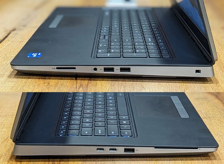 Dell Precision 7760 از یک سیستم خنک کننده حرفه ای دو فن با هیت پایپ های متعدد بهره می برد که مخصوص پردازنده ها و گرافیک های پرمصرف طراحی شده است. این سیستم به شکلی عمل می کند که حتی تحت فشار کاری سنگین، دما در محدوده ایمن باقی بماند. صدای فن ها در بار کاری بالا شنیده می شود اما آزار دهنده نیست و نشان دهنده عملکرد صحیح سیستم خنک سازی است. از نظر درگاه های ارتباطی، این لپ تاپ کاملا بی رقیب است. وجود پورت های Thunderbolt 4، USB Type-A، HDMI، mini DisplayPort، LAN و کارت خوان حرفه ای باعث می شود برای اتصال انواع تجهیزات جانبی هیچ محدودیتی نداشته باشید. این تنوع پورت، Precision 7760 را به گزینه ای ایده آل برای میزهای کاری حرفه ای و چند مانیتوره تبدیل می کند.