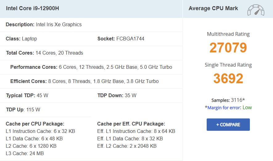 پردازنده Intel Core i9-12900H از نسل دوازدهم Alder Lake شرکت اینتل است و در سال 2022 معرفی شده است. این CPU دارای 14 هسته (6 Performance + 8 Efficient) و 20 ترد است که سرعت پایه آن 2.5GHz و فرکانس توربو آن تا 5.0GHz افزایش می یابد. در تستهای بنچمارک سایت CPUBenchmark امتیاز حدود 27000 را کسب کرده که نشان از قدرت پردازشی فوقالعاده آن دارد.
