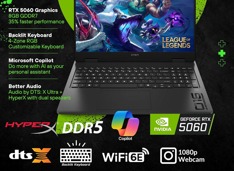 لپ تاپ HP Omen 16 به کارت گرافیک NVIDIA RTX 5060 با 8 گیگابایت حافظه اختصاصی GDDR6 مجهز شده است. این GPU از نسل Blackwell بوده و در سال 2025 معرفی شده است. پشتیبانی از Ray Tracing و DLSS نسل جدید باعث افزایش محسوس کیفیت بصری و نرخ فریم در بازی ها و نرم افزارهای گرافیکی می شود.
