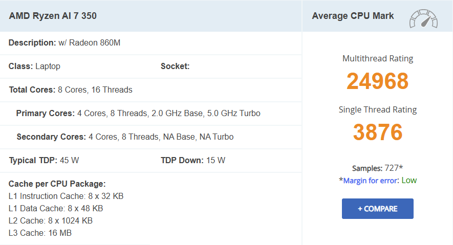| CPU | AMD Ryzen AI 7-350 (12C/24T, up to 5GHz, Zen 5) |