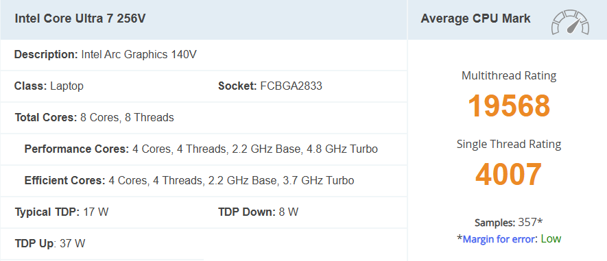 | CPU | Intel Core Ultra 7 256V (16 Cores, 22 Threads, 5.0GHz Turbo) |