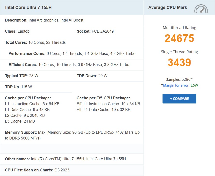 پردازنده Intel Core Ultra 7 155H یکی از CPU های نسل Meteor Lake است که در سال 2023 معرفی شده و در لپ تاپ های حرفه ای 2024 مورد استفاده قرار گرفته است. این پردازنده دارای 16 هسته (6 هسته Performance، 8 هسته Efficient و 2 هسته Low Power) و 22 رشته پردازشی است که عملکرد فوق العاده ای در پردازش چند هسته ای ارائه می دهد. فرکانس بوست بالا در کنار معماری جدید Intel AI Boost باعث بهبود راندمان در نرم افزارهای مدرن شده است.