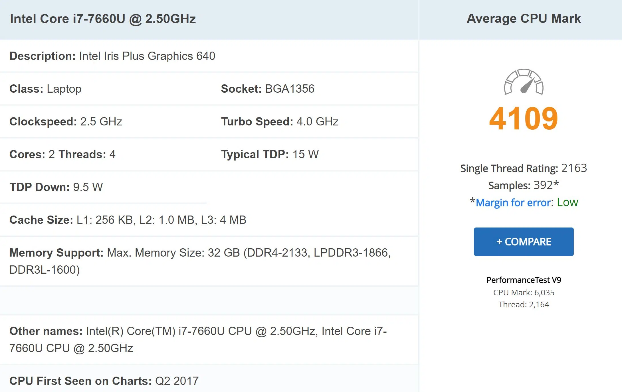 | CPU | Intel Core i7-7660U (2 Cores, 4 Threads, 2.5 – 4.0 GHz) |